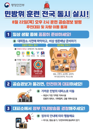 훈련 당일 공습경보가 발령되면 안내요원의 유도에 따라 신속하게 가까운 민방위 대피소로 대피하며, 대피소가 없으면 가까운 지하 시설로 대피하면 된다.