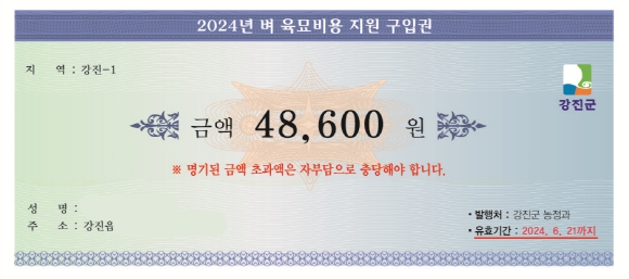 ▲ 강진군, 벼 육묘 비용 지원 구입권 13억9천만원 지급 |