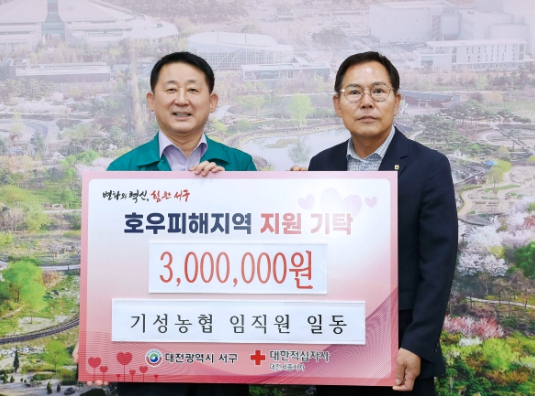 [뉴스서울] 대전 서구는 지난 12일 기성농협으로부터 지난달 집중호우로 인해 침수 피해를 입은 지역 주민을 위한 재해 성금 3,000천 원(삼백만 원)을 기탁받았다.