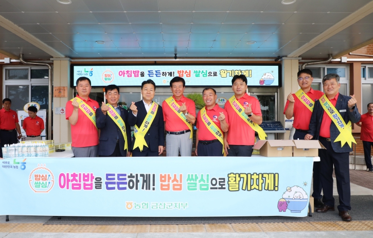 이날 박범인 금산군수, 박장순 농협은행 충남본부장, 박철우 농협금산군지부장 등 관계자 40여 명이 참석한 가운데 ‘아침밥을 든든하게!! 밥심 쌀심으로 활기차게!!’를 슬로건으로 출근하는 직원 및 주민 등에게 삼각김밥과 식혜 각 400여 개를 나눠줬다.