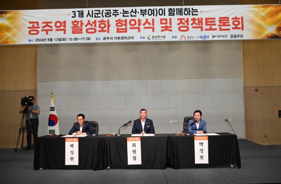이날 3개 시군은 업무협약을 통해 공주역 이용 활성화를 위한 공동 협력, 공주역 인지도 제고를 위한 다양한 전략과제 마련, 공주역 접근성 향상을 위한 교통망 개선 방안 강구 등에 상호 협력하기로 했다.