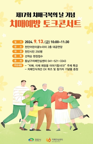 [뉴스서울] 천안시 동남구 치매안심센터는 9월 13일 천안어린이꿈누리터 대공연장에서 치매 인식 개선과 치매 극복을 위한 ‘제17회 치매극복의 날 기념 치매예방 토크 콘서트’를 개최한다고 29일 밝혔다.