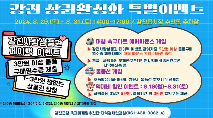 주요 이벤트로는 먹깨비 할인 이벤트, 강진읍 상권활성화 상품권 페이백 이벤트, 대형 축구다트 에어바운스 게임, SNS 내돈내산 특별 이벤트 등이 있다.
