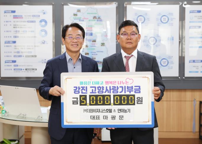 전남 강진군은 지난 12일 ㈜더원비즈니스호텔 대표 및 강진, 장흥 얀마농기계 대표를 역임하고 있는 마광문 대표가 강진군에 고향사랑기부금 5백 원을 기탁했다고 밝혔다.