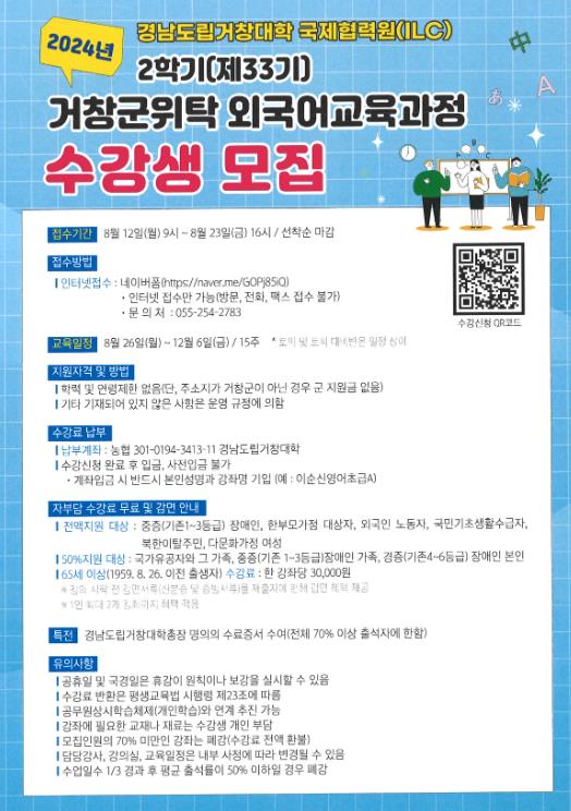 ▲ 거창군 2024학년도 2학기 거창군위탁 평생교육과정 수강생모집_국제협력원 포스터 |