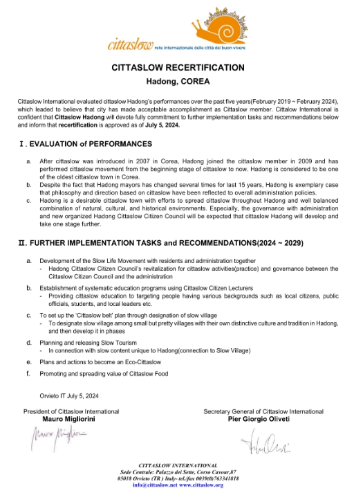 하동군은 이번 재인증 평가를 통해 오랜 슬로시티 도시 중 하나로서 지난 15년간 슬로시티에 기반한 철학과 방향성을 행정정책 전반에 반영한 모범적인 사례임을 인정받았다.