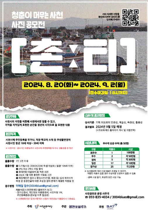 [뉴스서울] 사천문화재단은 ‘2024 BAT로스만스와 함께하는 청년문화예술지원사업’ 일환으로 ‘[촌:티] 청춘이 머무는 사천’이라는 주제로 사진 공모전을 개최한다고 20일 밝혔다.