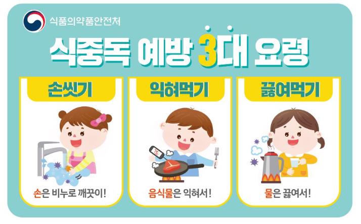 식중독 예방수칙으로 △흐르는 물에 비누로 30초 이상 씻기 △날음식과 조리음식 구분, 칼‧도마 구분 사용 △육류는 충분히 익혀먹기 (중심온도 75℃, 1분이상) △물 끓여 먹기 △식재료‧조리도구 깨끗이 세척‧소독하기 △보관온도 지키기(냉장식품 5℃이하, 냉동식품 –18℃이하) 등을 준수해야 한다.