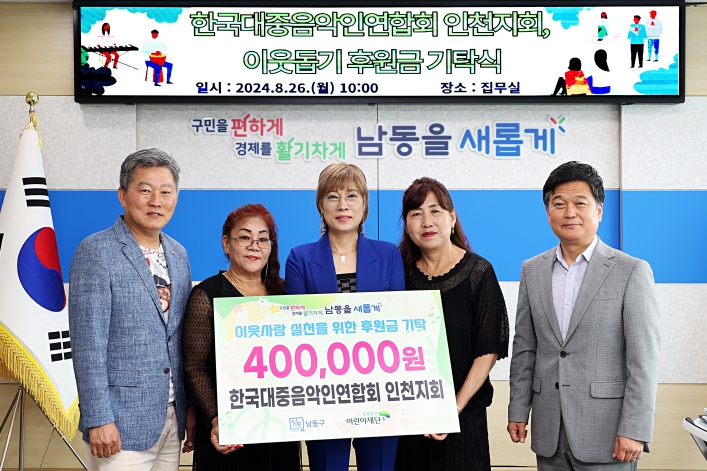 [뉴스서울] 인천시 남동구는 한국대중음악인연합회 인천지회로부터 이웃돕기 후원금 40만 원을 기탁받았다고 30일 전했다.