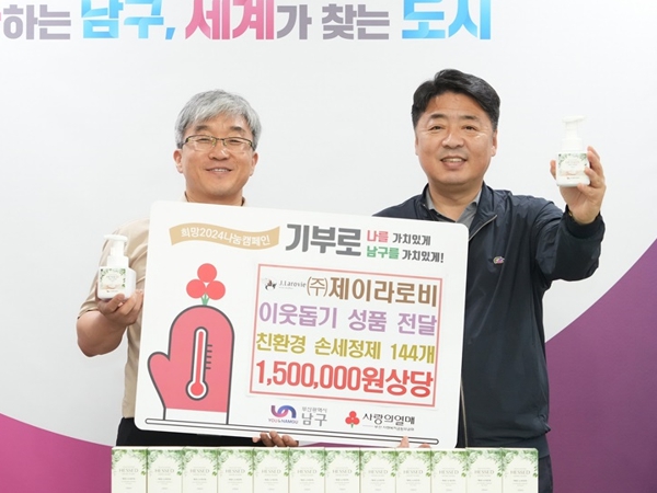 [뉴스서울] ㈜제이라로비에서는 지난 15일 부산광역시 남구에 150만원 상당의 후원물품(손세정제)을 전달했다.