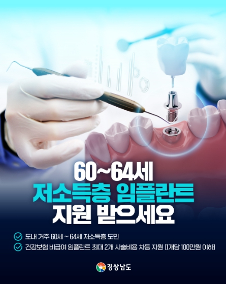 [뉴스서울] 경상남도는 지난해 하반기부터 시행한 ‘60~64세 저소득층 임플란트 지원사업’을 통해 현재까지 1,600여 명의 도민이 임플란트 시술비를 지원받았다고 밝혔다.