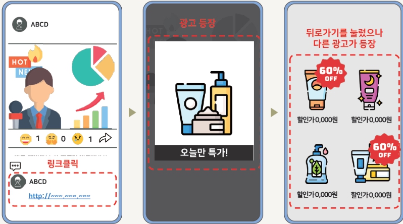 | ▲ 서비스 광고·알림 분야의 다크패턴 주요 예시(뒤로 가기로 광고를 탈출하려 시도하였으나 또다른 광고 등장) |
