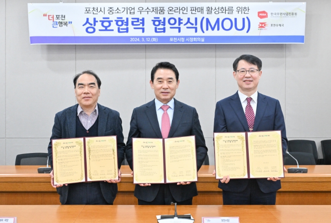 [뉴스서울] 포천시는 지난 12일 포천시청 시정회의실에서 한국우편사업진흥원, 포천우체국과 함께 중소기업 우수상품의 온라인 판로개척을 지원하기 위한 업무협약식을 개최했다.