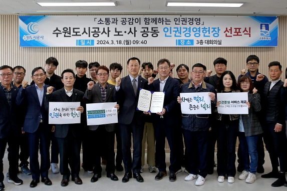 [뉴스서울] 18일 오전 수원특례시 권선구 더함파크 3층 대회의실에서 열린 소통과 공감이 함께하는 지속가능한 인권경영을 위한 ‘2024년도 수원도시공사 노·사 공동 인권경영헌장 선포식’에서 허정문 사장, 최태우 공사노동조합 부위원장 등 노·사 관계자 50여 명이 파이팅을 외치고 있다.