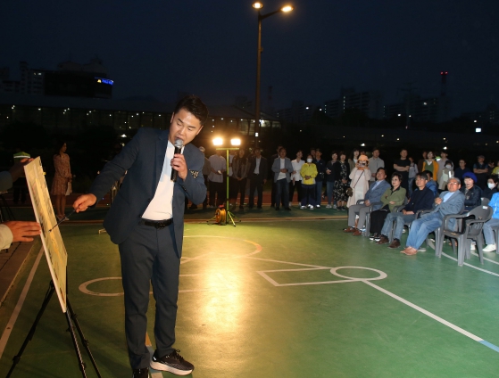 ▲ 오언석 도봉구청장이 지난 30일 열린 중랑천 ‘걷고 싶은 길’ 개장식에서 구민들에게 그간의 사업추진 현황에 대해 설명하고 있다. |
