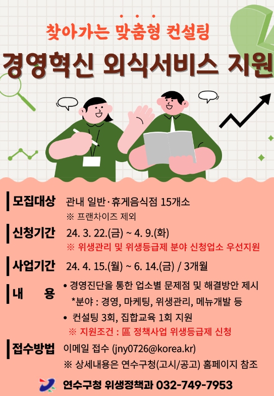 참여를 희망하는 업소는 연수구청 홈페이지 고시공고를 참고해 오는 4월 9일까지 신청할 수 있으며, 기타 자세한 사항은 연수구청 위생정책과로 문의하면 된다.