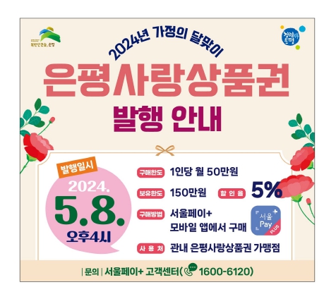 [뉴스서울] 은평구는 5월 가정의 달을 맞아 72억 원 규모의 은평사랑상품권을 오는 8일에 5% 할인된 금액으로 판매한다고 밝혔다.