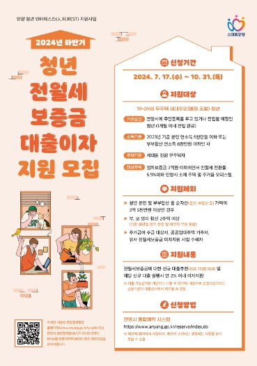 [뉴스서울] 안양시는 목돈 마련이 어려운 무주택 청년층의 주거 안정을 위해 시행하는 ‘청년 전월세보증금 대출이자 지원 사업’의 하반기 대상자를 모집한다고 17일 밝혔다.