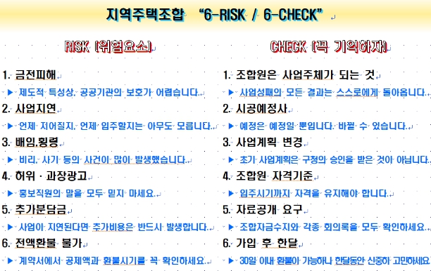 지역주택조합의 전국적 파산행렬과 사업정체로 인한 피해가 급증함에 따라 서구는 지역주택조합에 대한 구민의 이해도를 높이고 보다 신중하게 사업에 참여할 수 있게 돕고자 지역주택조합의 위험요소(Risk)와 가입 전 확인해야 할 사항(Check)을 제작하고 소식지와 안내문 등을 지속적으로 배포할 계획이다.