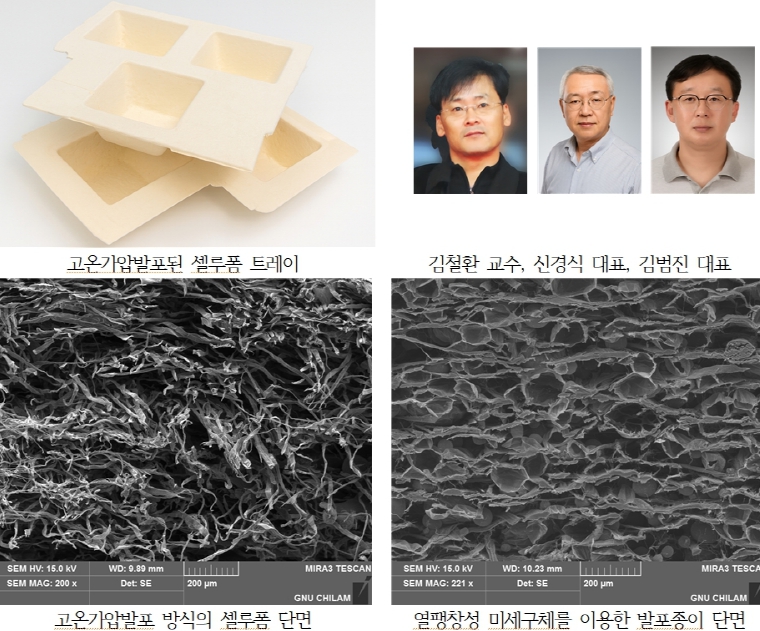 [뉴스서울] 경상국립대학교 농업생명과학대 환경재료과학과 김철환 교수 연구팀은 셀룰로오스 섬유, 전분, 열팽창성 미세구체, 계면활성제 등을 조합해 고온가압발포 방식으로 제조하는 친환경 발포 포장재 ‘셀루폼(Cellufoam)’ 개발에 성공했다.