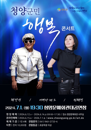 이번 ‘청양군민 행복 콘서트’에는 초대 가수 박강성과 민해경이 출연해 주민들에게 즐겁고 흥겨운 무대를 선사한다.