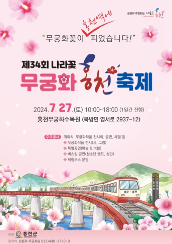 이번 제34회 나라꽃 무궁화 홍천축제는 용문 홍천철도 조기 착공을 염원하고자 “무궁화꽃이 홍천역에 피었습니다’라는 주제로 열린다.