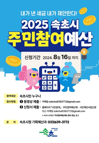 [뉴스서울] 속초시는 2025년도 본예산에 반영할 주민참여예산 시민제안사업을 오는 8월 16일까지 공모한다.