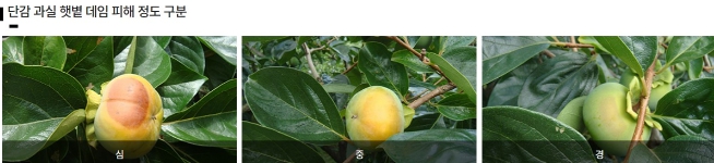 특히, 단감을 중심으로 폭염으로 인한 뜨거운 햇살에 햇볕데임(일소) 피해가 발생하여 과원 생육에 악영향을 주고 있다. 햇볕데임(일소) 피해는 과수에 수분이 부족했을 때 발생하기 쉬운 만큼 과수원 토양이 마르지 않도록 물을 충분히 공급하고 나뭇가지를 과실 쪽으로 끌어당겨 직사광선에 노출되는 부위를 최소화해야 한다.