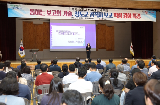 [뉴스서울] 청도군은 2일 국민체육센터 실내체육관에서 김하수 청도군수를 비롯한 공직자 600여 명이 참석한 가운데 직원들의 보고서 작성 능력을 제고하고 대면 보고 역량을 강화하기 위한 ‘통하는 보고의 기술’ 특강을 실시했다.
