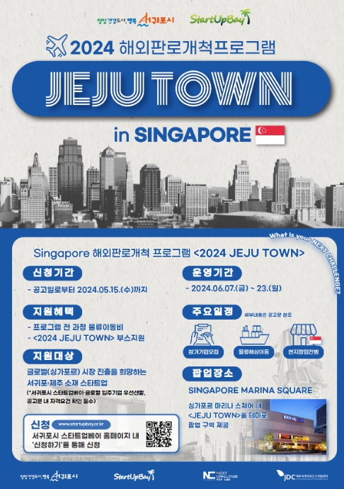 [뉴스서울] 서귀포시는 서귀포시 스타트업베이를 통해 싱가포르 현지에서 오는 6월 7일부터 23일까지 입주기업 및 서귀포시· 제주도에 기반을 둔 스타트업들의 해외판로개척을 지원하기 위한 '2024 JEJU TOWN in SINGAPORE' 프로그램을 운영한다고 밝혔다.