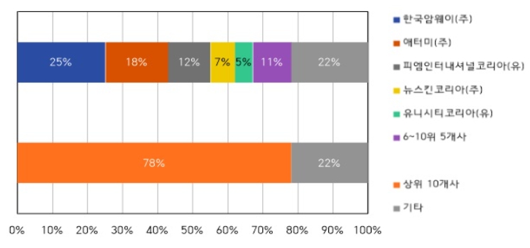 한국암웨이㈜, 애터미㈜ 등 매출액 기준 상위 10개사가 전체 시장 매출액 합계에서 차지하는 비중은 약 78%로 시장 매출액의 대부분을 차지하고 있고, 이들의 등록 판매원 수도 시장 전체 등록 판매원 수의 약 74%를 차지하는 등 상위 업체들에 집중화된 시장구조가 지속되고 있다.