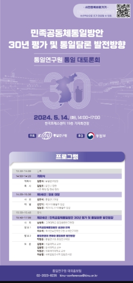 [뉴스서울] 통일연구원이 주최하고 통일부가 후원하는 「민족공동체통일방안 30년 평가 및 통일담론 발전방향」 토론회가 5월 14일 14:00~17:00 한국프레스센터 기자회견장(19층)에서 개최된다고 밝혔다.