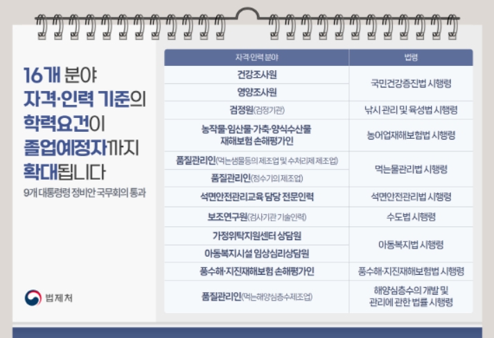 이번 개정으로 건강조사원, 손해평가인, 가정위탁지원센터 상담원 등 16개 분야의 자격 기준 및 인력 기준에서 '고등교육법'에 따른 대학 등의 졸업자로 한정되어 있는 학력 요건이 졸업예정자까지 확대된다.