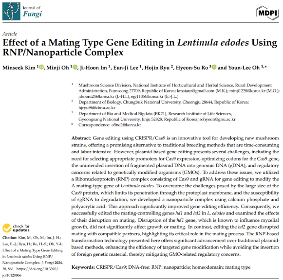 [뉴스서울] 농촌진흥청은 리보핵산단백질(RNP) 유전자 가위로 만든 표고버섯 교배형 유전자 교정체를 활용해 교배의 핵심 역할을 하는 유전자 기능을 학계 최초로 밝히는 데 성공했다.