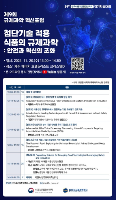 제9회 규제과학 혁신포럼에서는 식약처의 규제과학 혁신 정책 방향과 디지털 행정 혁신에 대한 강연을 시작으로, 인공지능 기반 위해평가 기술, 천연물 유래 기능성 소재 및 동물세포 기반 식품개발 가능성 등에 대하여 산업계와 학계 전문가 발표가 진행된다.