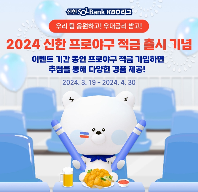 또한, 신한은행은 ‘2024 신한 프로야구 적금’ 상품 출시 기념으로 다음달 4월 30일까지 적금 가입 고객을 대상으로 추첨을 통해 마이신한포인트, 편의점 상품권, 테이블석 티켓을 제공하는 이벤트도 함께 진행한다. 한편, ‘쏠야구’에서는 정규리그 기간 중 응원 구단 승리마다 최대 1천 마이신한포인트를 제공하는 ‘Winning 캘린더’, ‘2024 신한 프로야구 적금’ 월 최대 한도인 50만원을 입금하거나 응원 구단 승리 다음날 5천원 이상 추가 납입시 최대 1천 마이신한포인트를 제공하는 ‘세이브 포인트’ 등 다양한 콘텐츠를 선보일 예정이다.