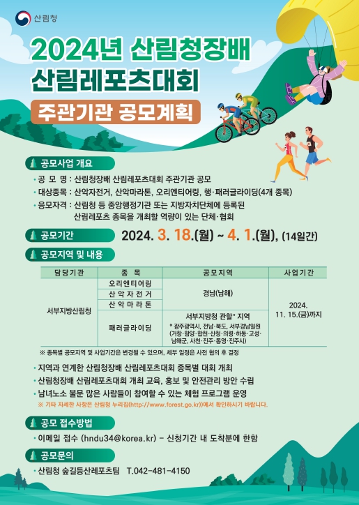 [뉴스서울] 산림청은 산림레포츠의 저변 확대 및 활성화를 위해 2024년 산림청장배 산림레포츠대회 주관기관을 오는 4월 1일까지 공모한다고 20일 밝혔다.