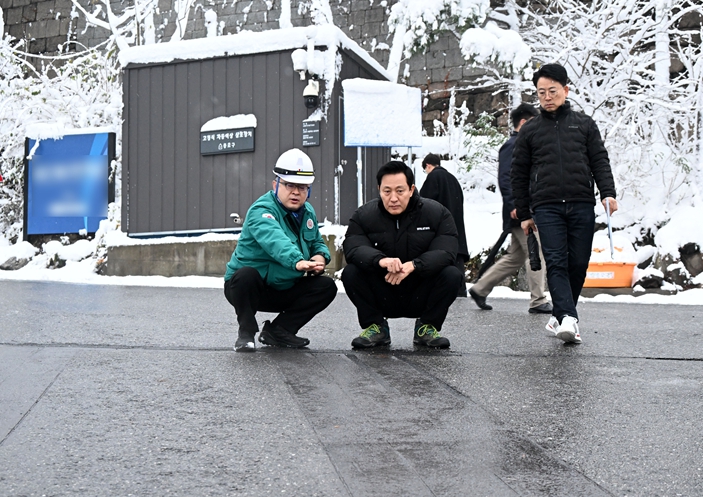 오 시장은 경사지 자동염수장치의 살포가 정확히 이뤄지는지, 도로 열선이 제대로 작동되는지 살피고 취약한 이면도로의 제설 작업의 진행 상황을 확인하며 시민 안전을 챙겼다.
