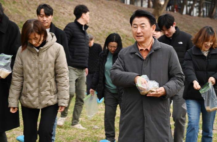 | ▲ 김동근 시장이 3월 11일 중랑천에서 개최된 ‘청보리 밟아보리 행사’에서 시 직원들과 함께 보리밟기하고 있다. |