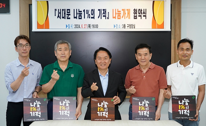 구는 최근 구청장실에서 북청사(40호), 가좌서울치과(44호), 무안갯벌낙지(45호), 맛있는칼국수(46호), 풍천백세장어(47호), 라파엘종합동물병원(50호), 춘향골남원추어탕(55호), 알레스구떼(57호)와 ‘서대문 나눔1%의 기적’ 협약을 체결했다.