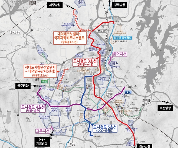 대전시는 도시철도 3ㆍ4ㆍ5호선 건설과 더불어 현재 추진 중인 충청권 광역철도 1ㆍ2단계, 대전~세종~충북 CTX, 대전~옥천 간 광역철도와 함께 장기적으로는 대전 주변 금산, 논산, 공주, 세종으로 도시철도 2, 3, 4호선을 연장하는 광역철도 사업을 통해 대전을 중심으로 한 충청권 메가시티 철도교통망 체계를 완성시킬 방침이다.