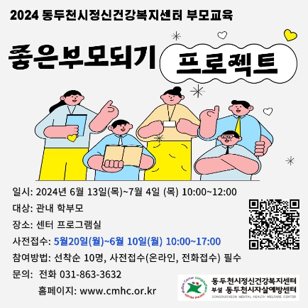 [뉴스서울] 동두천시정신건강복지센터는 5월 20일부터 관내 학부모를 대상으로 부모 교육‘좋은 부모되기 프로젝트’참여자를 선착순 10명 모집한다고 밝혔다.