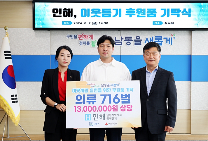 [뉴스서울] 인천시 남동구는 지역사회 공헌 봉사단체 ‘인해’로부터 취약계층을 위한 후원품 의류 716벌(1,300만 원 상당)을 기탁받았다고 11일 밝혔다.