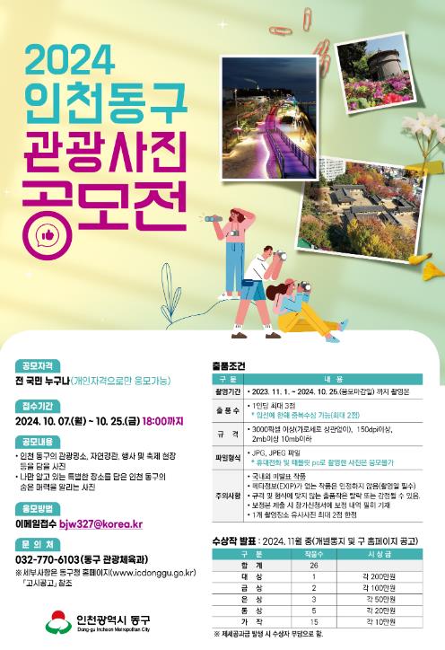 단 2023년 11월 1일 이후 인천 동구에서 촬영한 작품이어야 하며, 접수기간은 10월 7일부터 25일까지로 1인당 3개까지만 출품 가능하다.