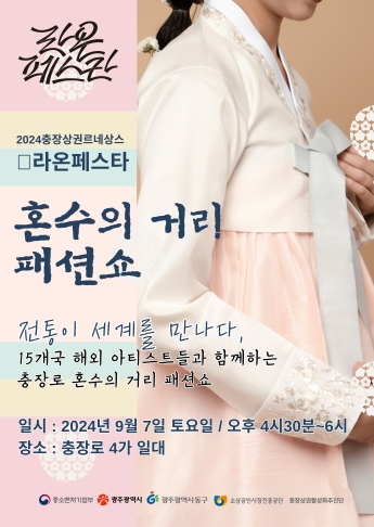 한복 패션쇼에서는 ‘2024 세계 여성미술연합 페스타’ 주인공인 해외 아티스트 100여 명이 참여하며 이중 18명이 모델로 무대에 오른다. 이들은 충장로 4가 한복 명인들이 제작한 한복을 입고 런웨이를 하며 국가를 대표하는 전통의상을 선보일 예정이다.