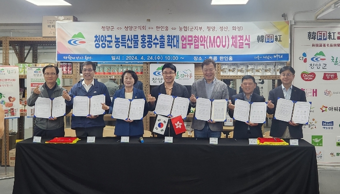 [뉴스서울] 청양군이 지난 24일 한국 한인홍 홍콩유한회사 본사(홍콩 춘완웨스트)에서 이종필 청양부군수, 청양군의회 차미숙 의장, 농협(청양군지부, 청양・정산・화성) 관계자와 한국 한인홍 간의 다자간 업무협약을 체결했다.