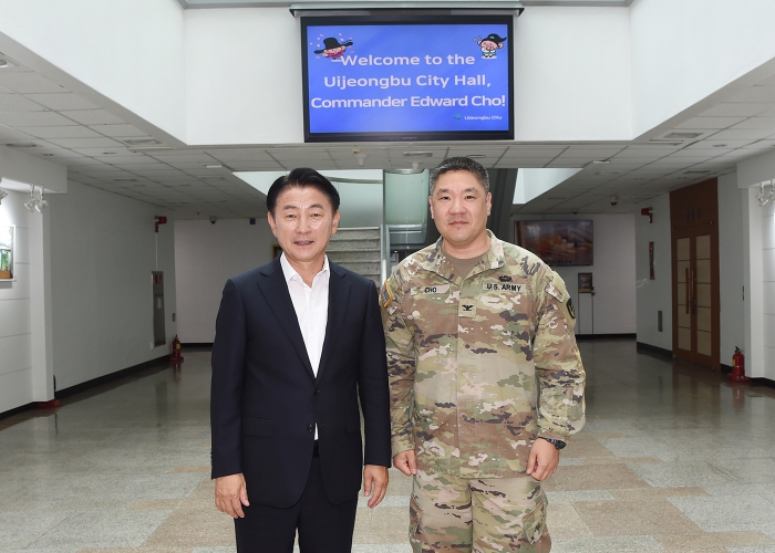 [뉴스서울] 김동근 의정부시장이 7월 16일 에드워드 조 용산-케이시 기지사령관을 영접하며 두 기관의 우호 증진 방안을 논의했다.