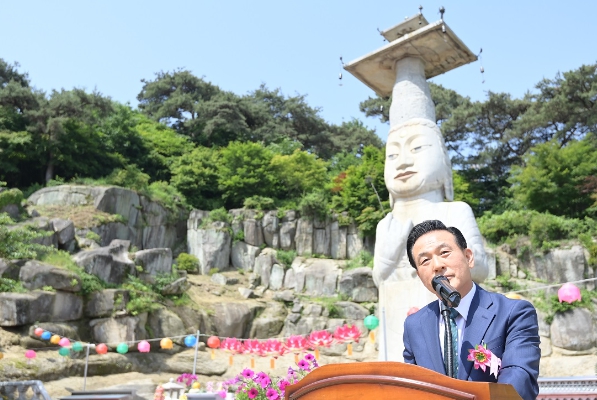 관촉사 법요식 행사에 참석한 백 시장은 축사를 통해 “향기로운 꽃향기처럼 아름다운 삶을 살아야한다며, 남을 미워하지 말고 부처님 말씀처럼 겸손하고 사랑해야 한다”고 말했다.