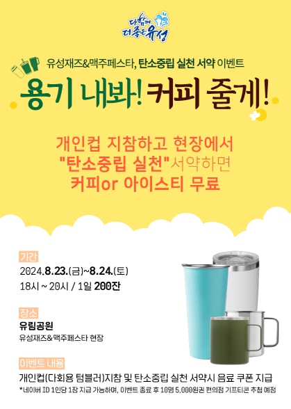 [뉴스서울] 대전 유성구는 23일과 24일 양일간 유성 재즈&맥주 페스타 현장에서 탄소중립 실천을 서약한 개인 텀블러 지참자에게 무료 음료(아메리카노 or 아이스티) 쿠폰을 지급한다고 전했다.