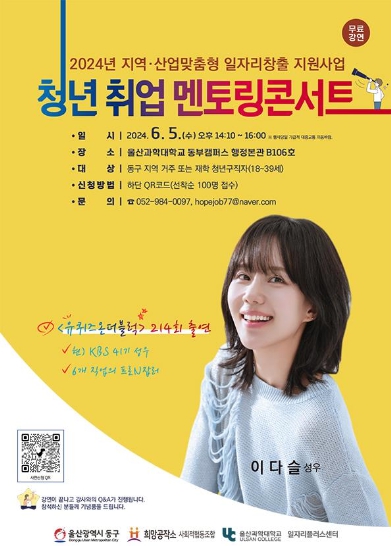 울산 동구는 2024년 지역·산업맞춤형 일자리창출 지원사업의 일환으로, ‘청년 취업 멘토링콘서트’를 오는 6월 5일 오후 2시부터 2시간 동안 울산과학대 동부캠퍼스에서 개최한다.